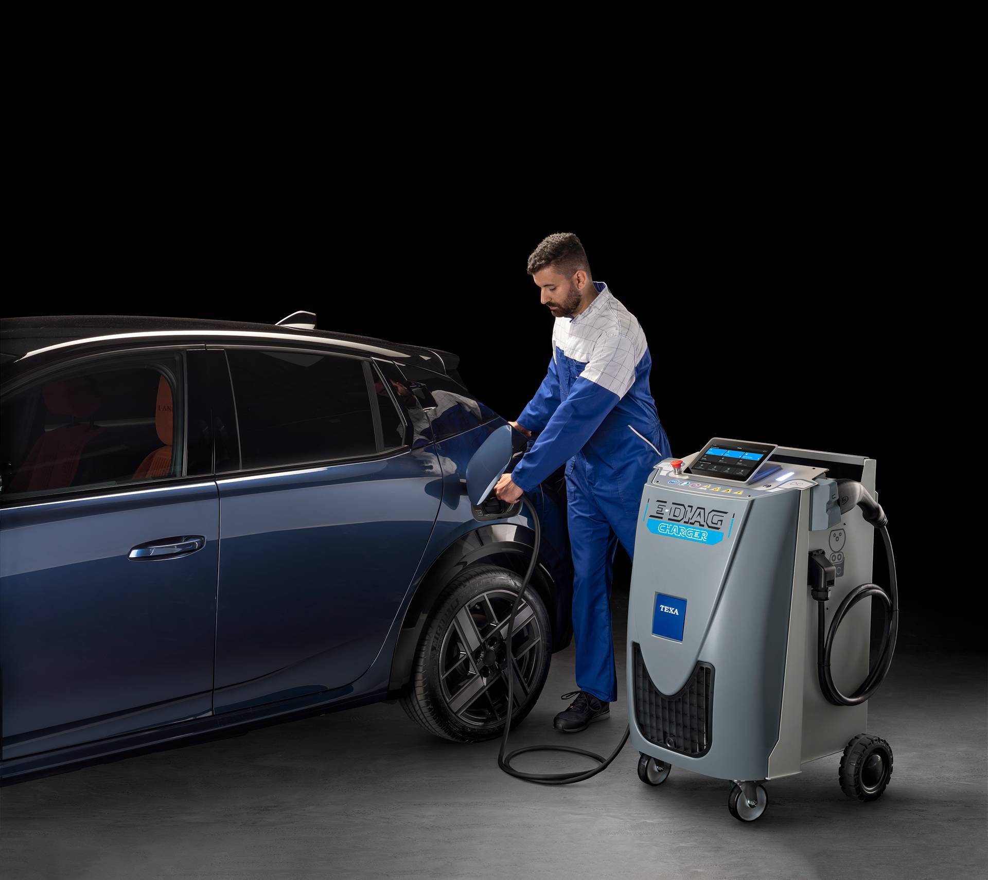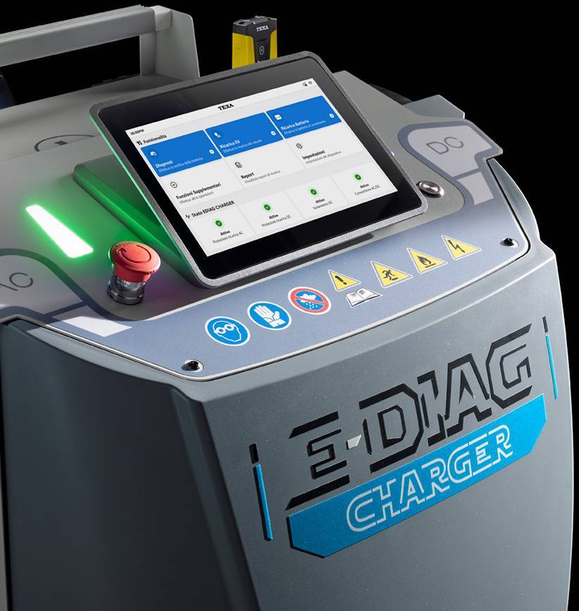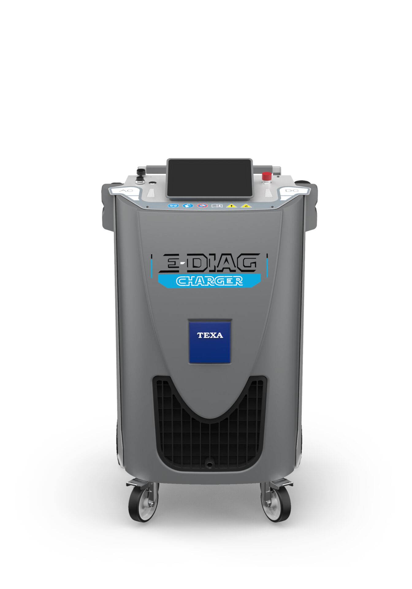 To effectively address the new operational needs related to the management and maintenance of next-generation vehicles—whether electric, hybrid, or plug-in—TEXA has developed the E-DIAG CHARGER. This is an advanced mobile charging and diagnostic device that supports both direct current (DC) and alternating current (AC) charging, with DC capabilities up to 1000 V.