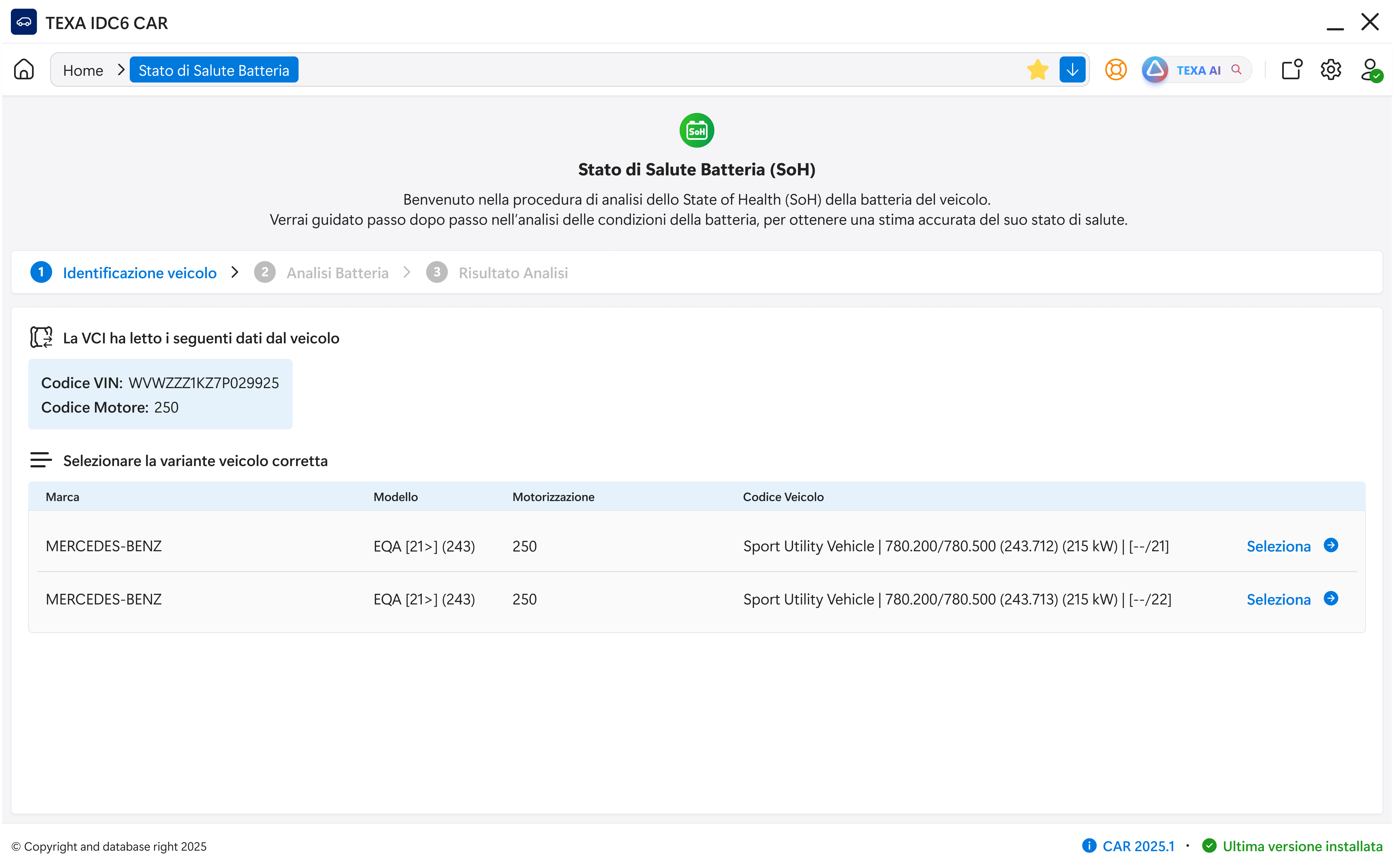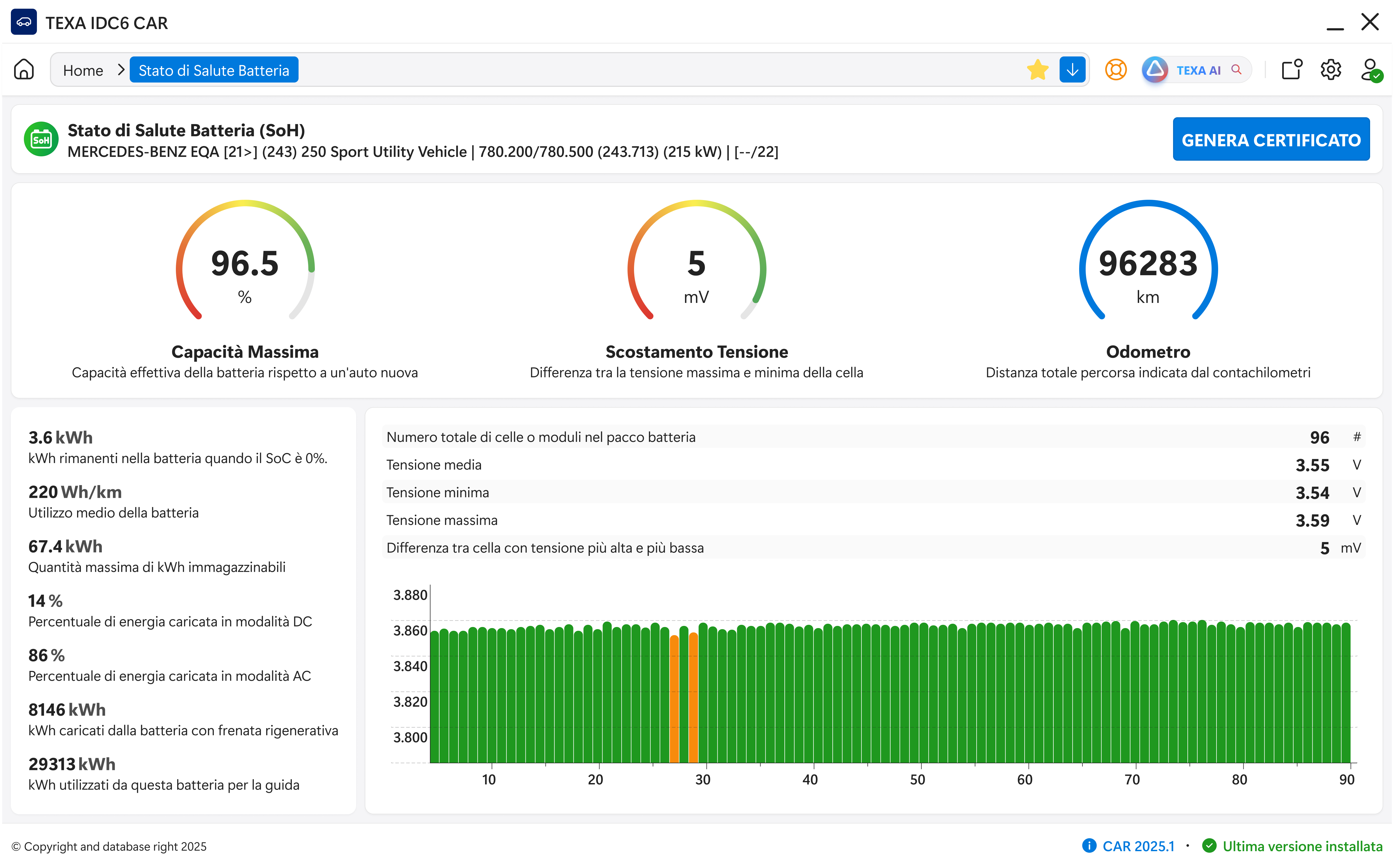 In this sense TEXA developed a process that returns an accurate percentage valuation of the battery ‘s State of Health (SoH), through the parameters obtained directly from the control units and processed in cloud. This procedure is a standard in E-DIAG CHARGER. Furthermore, mechanics who want to offer their customers an accredited certificate relating to the battery state of health can request it directly from the tool. They will receive it within a few minutes at their email address.
